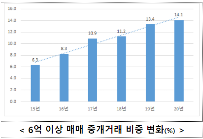 * 거래비중 변화(%) : (매매 6억 이상 중개거래) ‘15년 6.3% → ’20년 14.1%