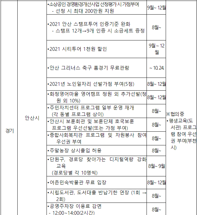- 중앙부처 및 지방자치단체는 기존 코로나19 예방접종자에 대한 감면 및 할인 조치를 임상시험 참여자에게도 적용*하는 한편, 추가적인 지원 방안도 마련하여 백신 개발에 참여한 임상시험 참여자에 대한 혜택을 제공할 계획이다.