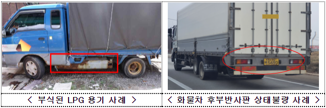 LPG 용기 가스누출로 인한 화재를 방지하고, 화물차 야간 추돌 사고를 예방하기 위해 자동차 검사항목에 LPG 용기의 부식여부와 화물차(7.5톤 이상) 후부반사판 설치 여부를 추가합니다.