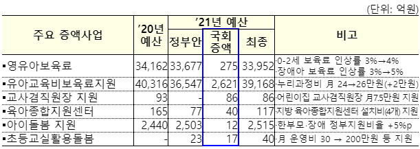 * 유아보육료(만원): (’13~’19) 22 → (’20) 24 → (’21案) 24 → (’21최종) 26만원