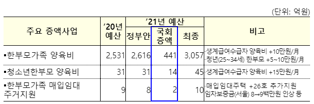 ㅇ (주거) 한부모가족 매입임대 지원물량(+26호), 임차보증금 인상(서울기준 8→9백만원) 등 주거부담 경감(+2.4억원)