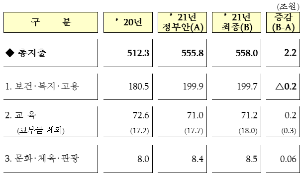 ㅇ 총지출은 정부안(555.8조원) 대비 +2.2조원 증가한 558.0조원(증액 7.5조원, 감액 △5.3조원)