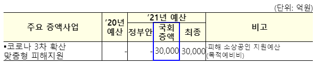 ㅇ 코로나 3차 확산 피해를 받는 업종‧계층에 대한 맞춤형 지원 재원 3.0조원 반영(목적예비비 활용)