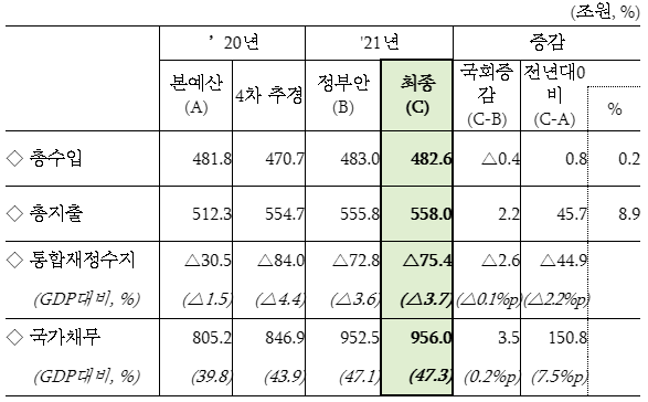 ㅇ 국가채무는 정부안 대비 +3.5조원 증가한 956.0조원 (GDP대비 47.3%)