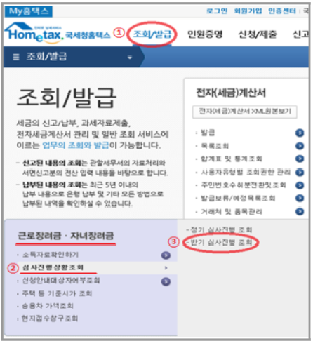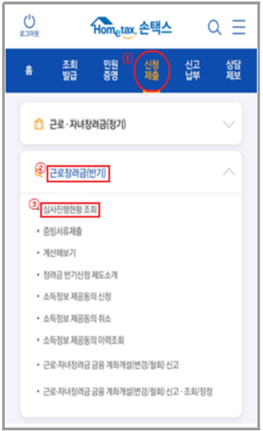 ○로그인 > 신청/제출 > 근로장려금(반기) > 심사진행현황 조회