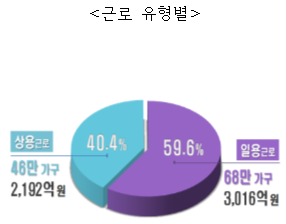 □ (근로유형별) 일용근로 가구는 68만 가구(59.6%), 상용근로 가구는 46만 가구(40.4%)로 일용근로 가구가 상용근로 가구에 비해 22만 가구, 19.2%p 많은 비중을 차지하고 있습니다.
