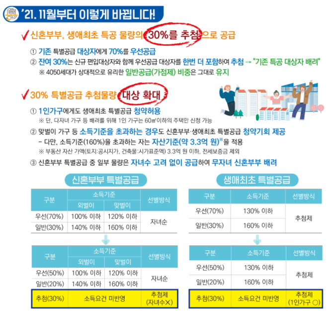 ① (대상 확대) 30% 추첨 물량에 대해 1인 가구도 생애최초 특별공급 청약을 허용하고, 현행 소득기준을 초과하는 맞벌이 가구도 신혼부부·생애최초 특별공급 청약기회를 제공한다.