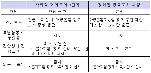 - 외부인 출입, 특별활동·외부활동, 집단행사·집합교육 금지 -