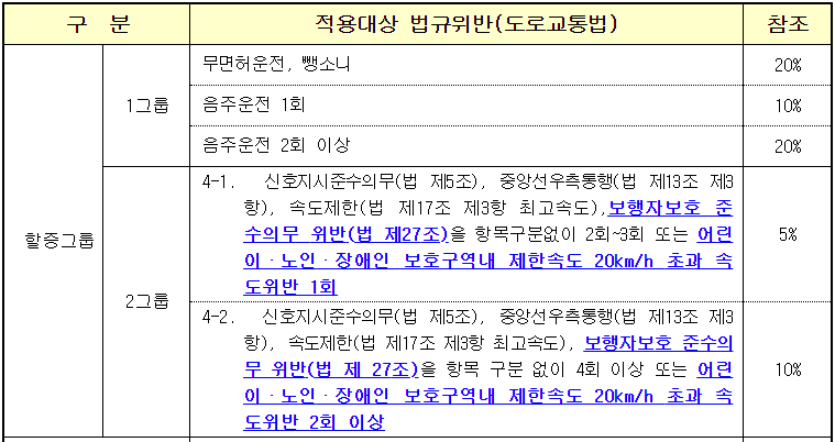 ▸(보험료 5% 할증) 어린이 보호구역 등 속도 위반(20km/h 초과) 1회 위반 횡단보도 보행자 보호 2~3회 위반