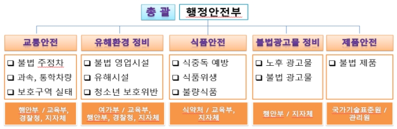 ㅇ 점검분야 : 교통, 유해환경, 식품안전, 불법광고물, 제품안전 등 5개 분야