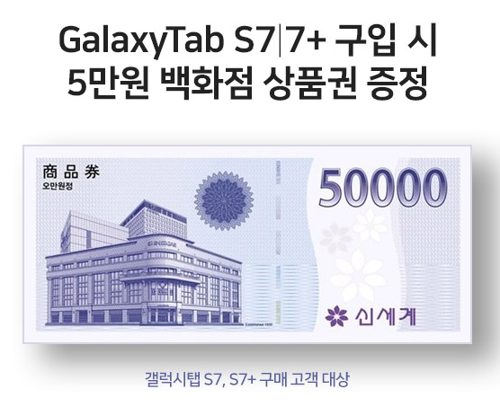 - 최대 60,000원 증정 : 각각 선착순 1,300대 한정(Galaxy Tab S7 5만 원 증정, Galaxy Tab S7+ 6만 원 증정)