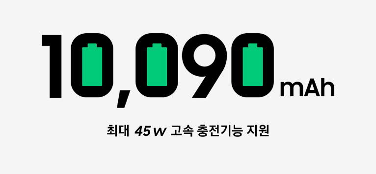 - 배터리 걱정 없이 일상에 집중할 수 있습니다. 한 단계 늘어난 대용량 배터리에 최대 45W 고속충전까지 지원되어 시간을 아껴줍니다.