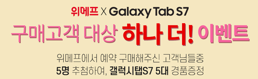 1) 구매고객 대상 하나 더!! 이벤트 : 위메프에서 예약 구매해주신 고객님들 중 5명을 추첨하여, 갤럭시탭S7 5대 경품증정