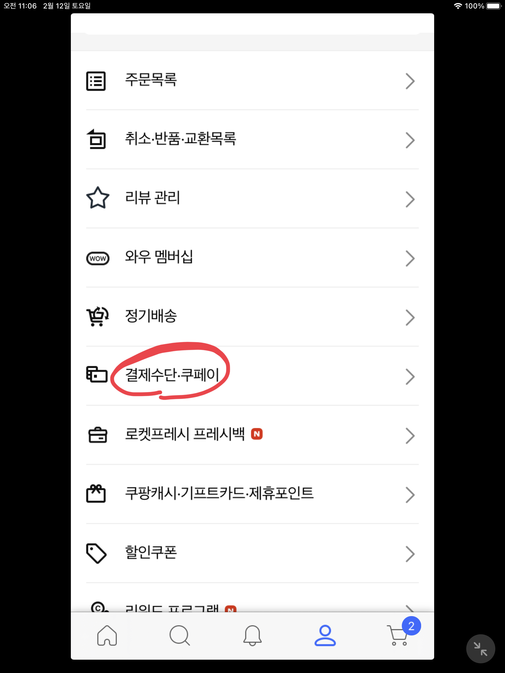 - 다시 메뉴창을 보시면 아래 가운데 그림처럼 '결제수단, 쿠페이'라는 항목이 있습니다. 클릭!