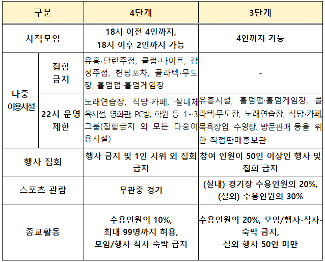 거리두기 수도권 4단계, 비수도권 3단계에 대한 핵심 방역수칙은 본 글 맨 아래 표를 참고하시기 바랍니다.