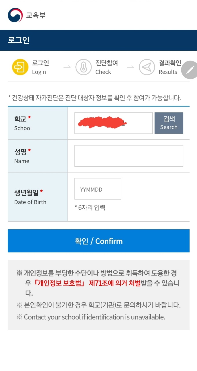 -> 교육부는 신학기 개학에 따라 등교 1주전(2.23~)부터 갱신된 계정으로 간강상태 자가진단을 활용하고 실재 등교일 건강상태 자가진단 결과에 따라 협조하여 주기를 각 학부모들에게 공지했습니다.