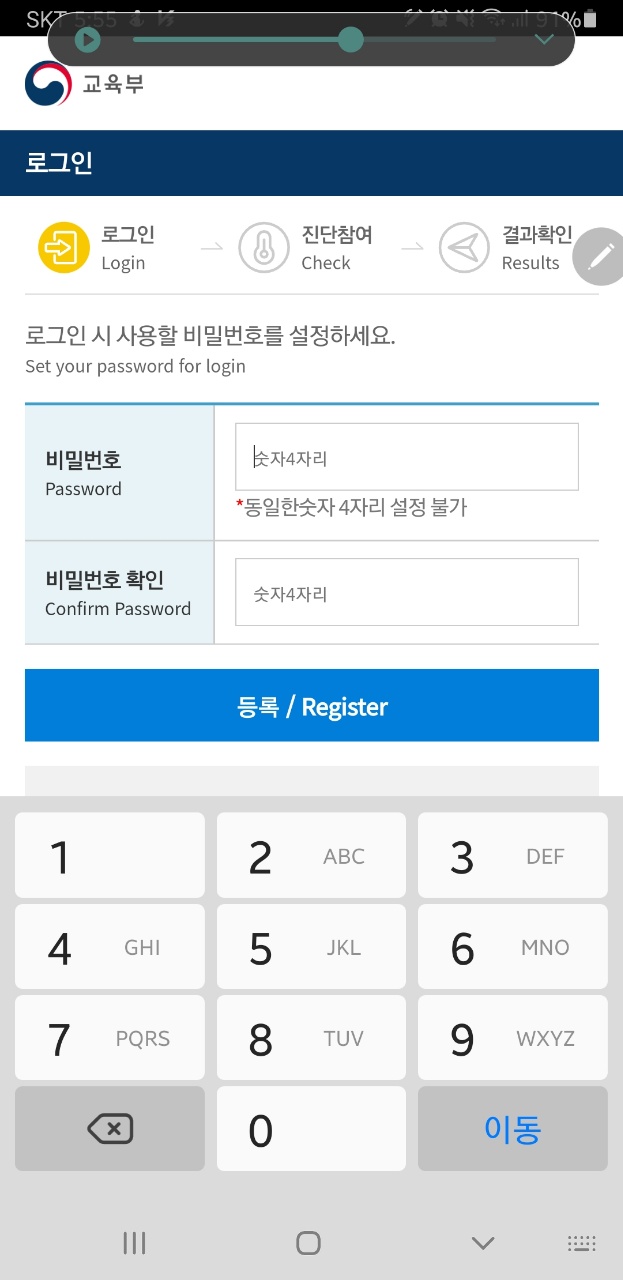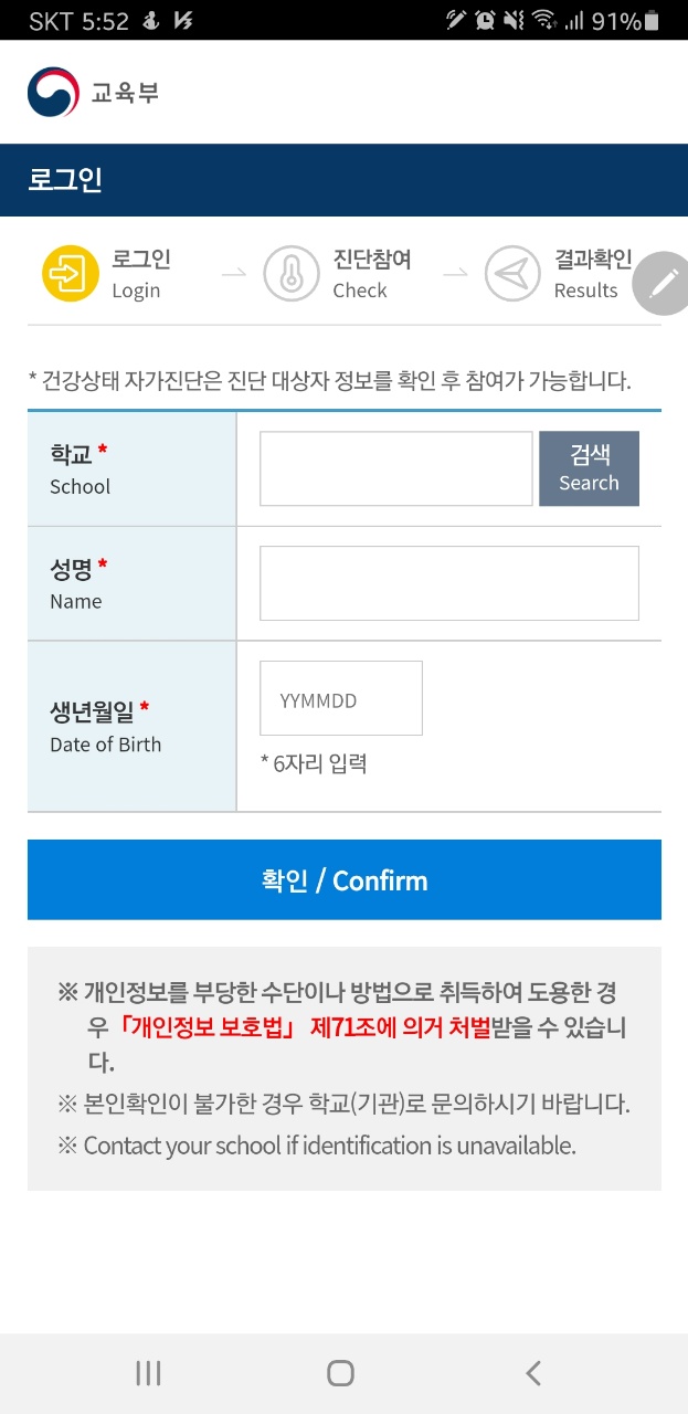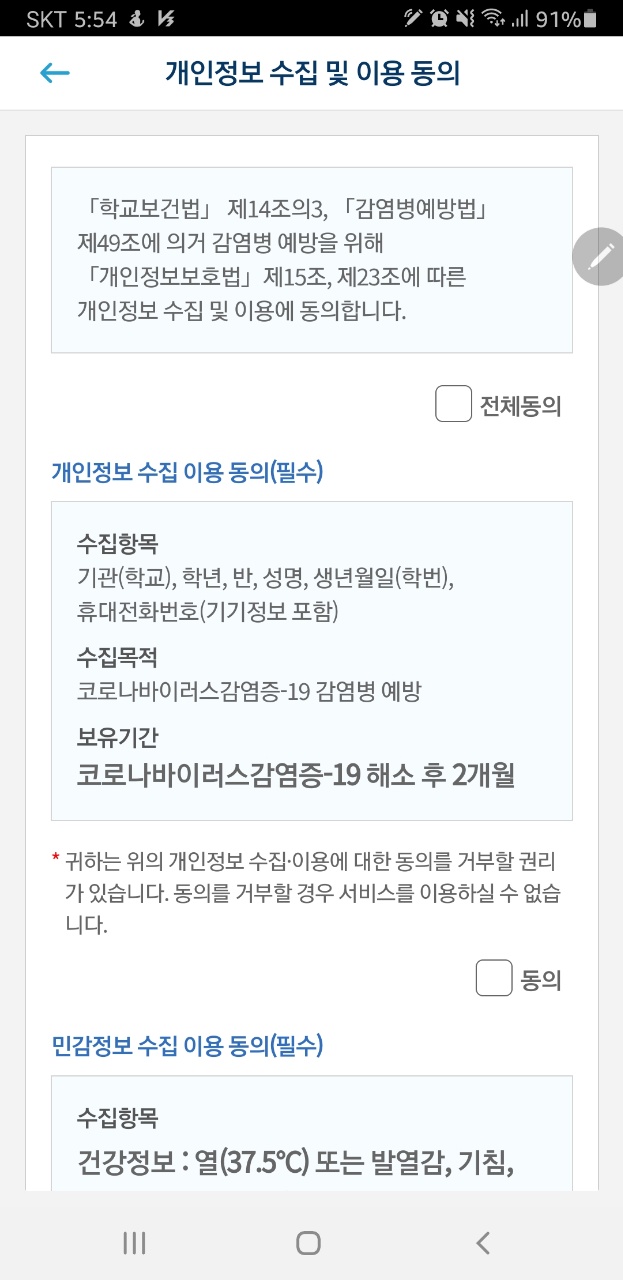 -> 교육부는 신학기 개학에 따라 등교 1주전(2.23~)부터 갱신된 계정으로 간강상태 자가진단을 활용하고 실재 등교일 건강상태 자가진단 결과에 따라 협조하여 주기를 각 학부모들에게 공지했습니다.