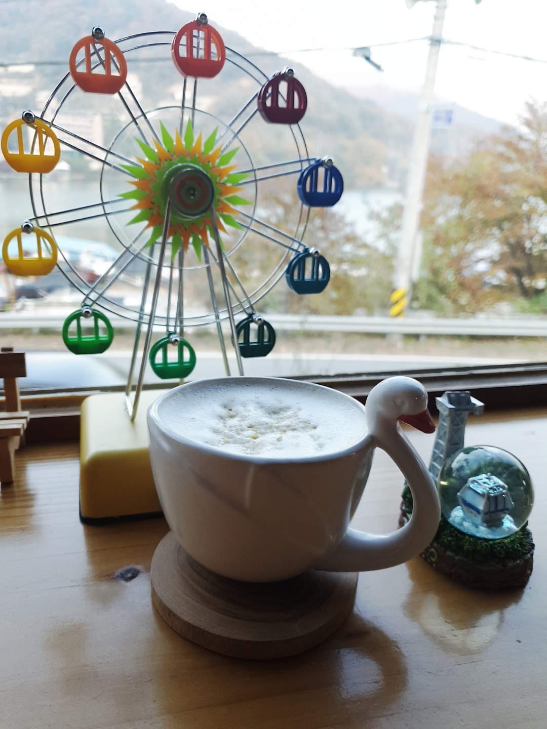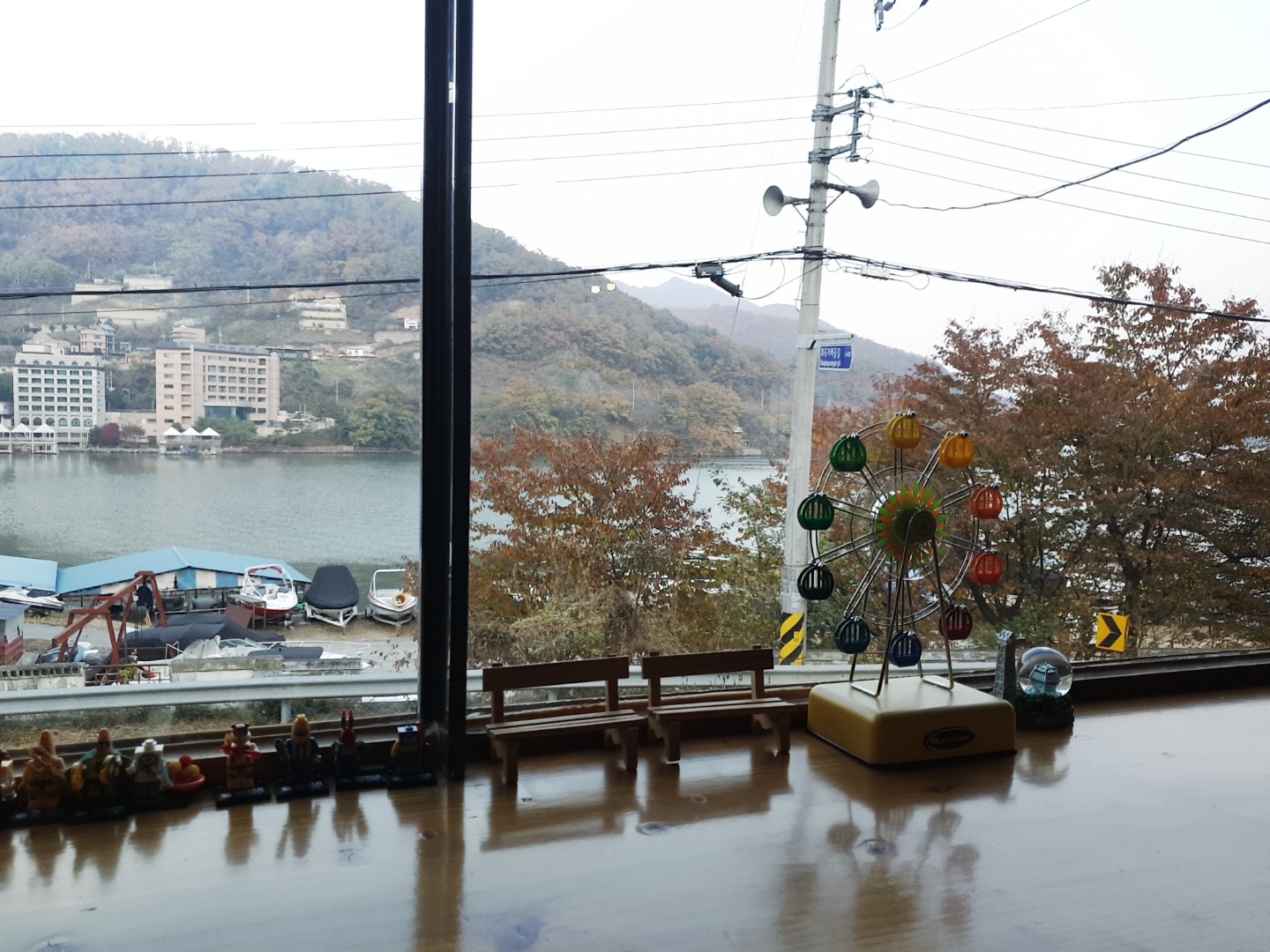 참새언덕 카페 가장 명당인 북한강이 바로 보이는 창가에 앉았습니다. 테이블 앞쪽에 작고 이쁜 소품들이 보입니다.