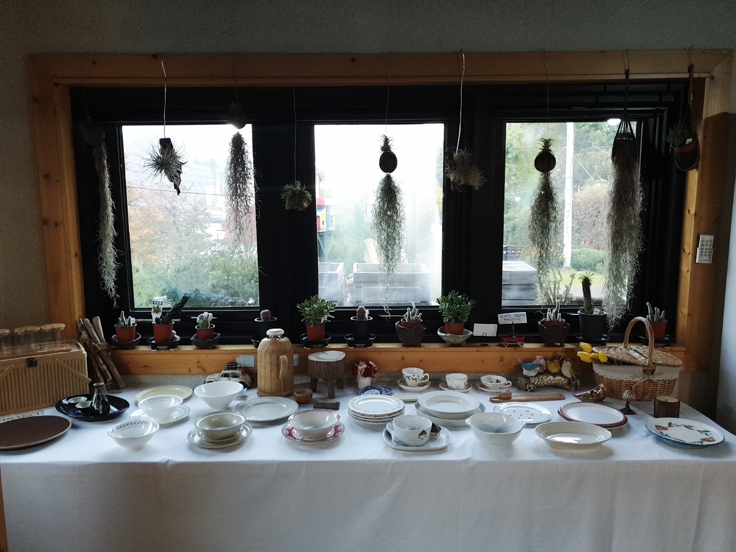 그리고 특색 있게 난로가 중아에 있고, 사이드 장소와 잎구 쪽에는 이쁜 소품과 그릇들이 진열되어 있네요~