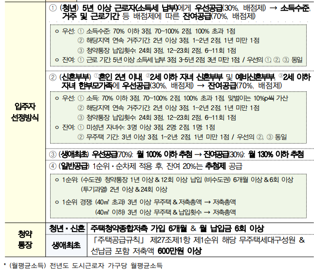 - 청년 : 일하는 청년(주택소유 이력이 없는 19~39세 미혼 청년)을 배려하기 위해 근로기간(소득세 납부) 5년 이상 해당하는 사람에게 청년 몫의 30%를 우선공급(본인소득, 해당지역 연속 거주기간, 청약통장 납입횟수 등 배점제)하고, 잔여물량(70%)은 본인소득, 근로기간 등을 고려하여 배점제로 공급합니다.