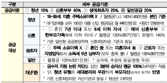 - 신혼부부 : 월평균 소득 130%(맞벌이 140%), 순자산(세대 기준) 3.4억 원 이하