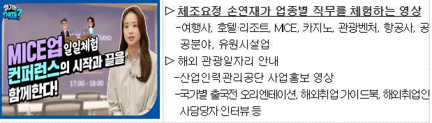 ㅇ ‘일자리홍보관’에서는 체조요정 손연재 씨가 직접 관광기업들을 방문해 선배들의 지도를 받고 일자리를 체험해보는 ‘여기는 어때’ 영상을 통해, 여행사, 호텔, 카지노, 항공사 등 관광 분야 주요 기업에서는 어떤 일들을 하는지, 취업을 위해서는 어떤 준비를 해야 하는지 등에 대한 정보를 유쾌하게 소개한다.