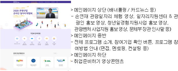 □ 아울러 구직자들이 취업을 준비하는 데 실질적인 도움을 받을 수 있도록 ‘취업정보관’에서는 11월 9일부터 전문 취업 상담사(컨설턴트)와 직장 선배(멘토)가 직접 1:1 화상 상담을 진행하고, ‘4차 산업시대 관광흐름’, ‘관광벤처 창업 성공기’ 등 취업 준비생들이 꼭 알아야 할 비법 등을 영상자료로 제공한다.