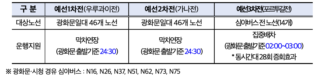광화문광장 거리응원에 대한 버스정류소 폐쇄, 지하철 연장 운영 등에 대한 아래의 내용을 숙지하시고 착오 없으시기 바랍니다.