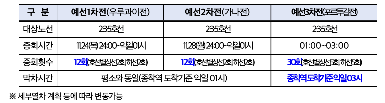 - (지하철) 1,2차전 자정부터 증회, 3차전 막차시간 연장하여 증회 운행