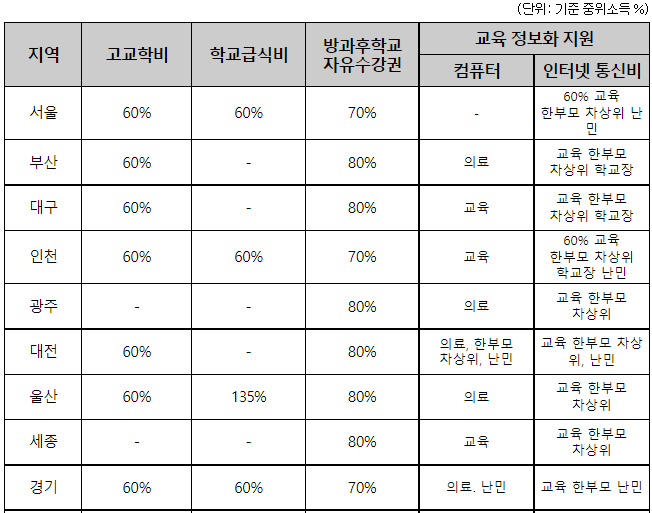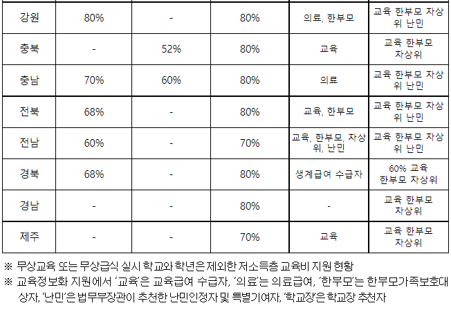 -> 또한 각 시도별로 교육비 신청 자격 및 지원 기준이 상이할 수 있습니다. 아래의 표를 통해서 각 지역별 교육비 지원 상황을 참고하시기 바랍니다.