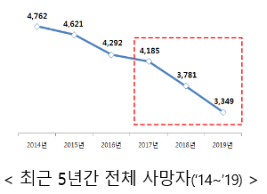 ㅇ ’18년에는 ‘76년 이후 처음으로 3천 명대 진입하였고, ’19년에는 ‘02년 이후 가장 높은 사망자 감소율(11.4%)을 기록하였으며, 특히, 2년간 어린이 사망사고는 절반(51.9%) 수준으로 감소하였다.