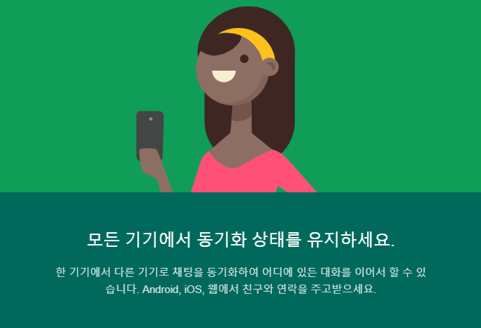 한 기기에서 다른 기기로 채팅을 동기화하여 어디에 있든 대화를 이어서 할 수 있습니다. Android, iOS, 웹에서 친구와 연락을 주고받으세요..