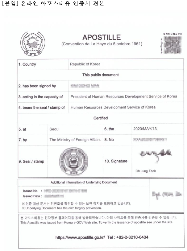 ※ 아포스티유 인증서는 온라인을 통해 발급 시 무료로 이용 가능