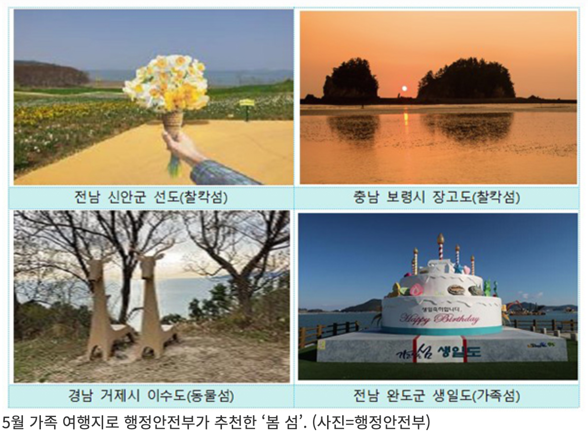 * 최훈 행안부 지방자치분권실장은 "가정의 달 5월을 맞아 가족과 함께 섬 여행을 통해 아름다운 추억을 만들어 보길 권하고, 앞으로 섬 관광자원을 발굴하고 섬답게 가꾸어서 관광지로서 섬의 매력을 경험할 수 있도록 적극 지원하겠다"고 전했습니다.