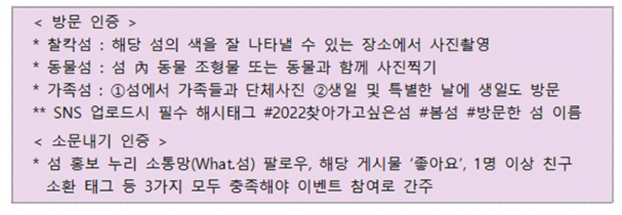 행정안전부는 누리 소통망과 한국섬진흥원에서 운영하는 섬 홍보 누리 소통망에서는 경품 행사도 진행합니다. 봄 섬 9곳을 방문해 인증하거나 섬 홍보 누리 소통망 팔로우 및 소문내기 인증을 하면 아이패드 등 경품을 제공합니다.
