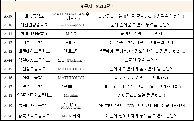 또한 전국 중․고․대학교의 수학동아리들이 직접 기획한 수학체험 콘텐츠50개와 유관기관 3개, 국립중앙과학관 5개를 4주간 1주 단위로 나누어 온라인에서 공개하고 체험 희망 학생이 신청하면 집으로 체험재료를 보내주는 방법으로 진행된다고 합니다.