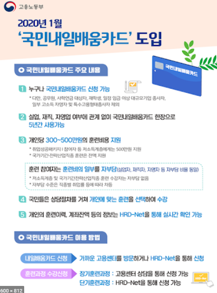 ** 국민내일배움카드 : 국민 대상(공무원, 사립학교 교직원 등 제외) / 5년간 1인당 300~500만 원