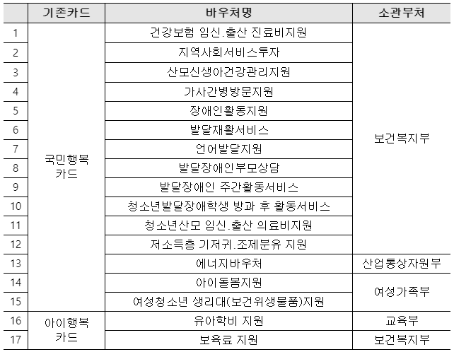 < 국민행복카드로 제공되는 바우처 목록 >