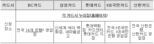 < 국민행복카드 발급 카드사별 신청장소 >