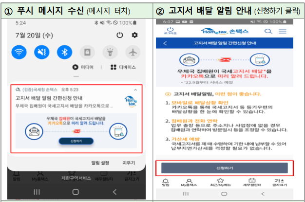 납세자가 국세청에서 발송한 모바일 안내문을 받은 후 홈택스에서 신청하면 다음날부터 배달 알림 서비스를 이용할 수 있습니다.
