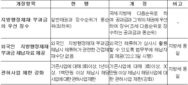 그 내용으로는 고액체납자의 명단공개, 체납자에 대한 관허사업 제한 확대, 체납처분시 우선 징수 규정 도입 등이 있습니다.