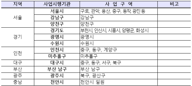 이에 따라, 국토교통부는 공모를 통해 서울시, 경기도 등 12개 지자체(사업구역: 30개 시‧군‧구)를 주거상향 지원사업 선도 지자체로 선정(‘21.1.7)하였습니다.