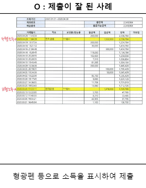 ▴ 통장 내역 제출 시, 급여를 표시하지 않고 전체 거래내역을 제출하는 사례