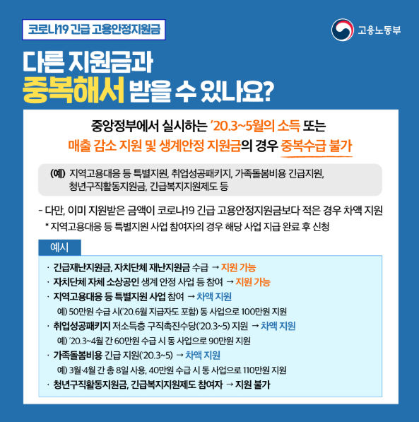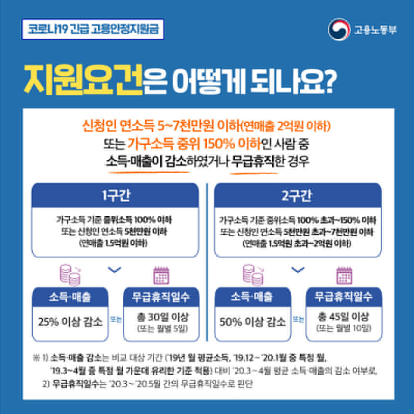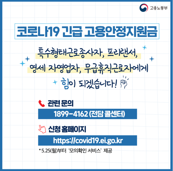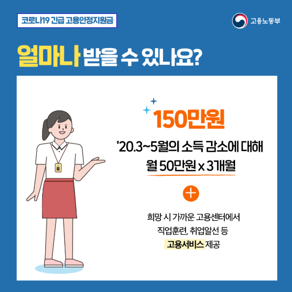 본 저작물은 ‘고용노동부’에서 ‘20년’ 작성하여 공공누리 제4유형으로 개방한 ‘긴급 고용안정지원금 신속 지급 대책 발표(작성자:고용노동부)’을 이용하였으며, 해당 저작물은 ‘고용노동부 홈페이지’에서 무료로 다운받으실 수 있습니다.