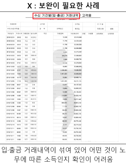 X : 보완이 필요한 사례: 소득 또는 매출 금액을 확인할 수 있는 정보가 없음
