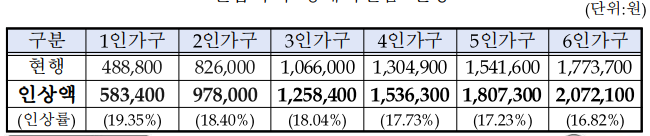 긴급복지생계지원금 인상액에 대한 내용은 아래의 표를 참고하시기 바랍니다.