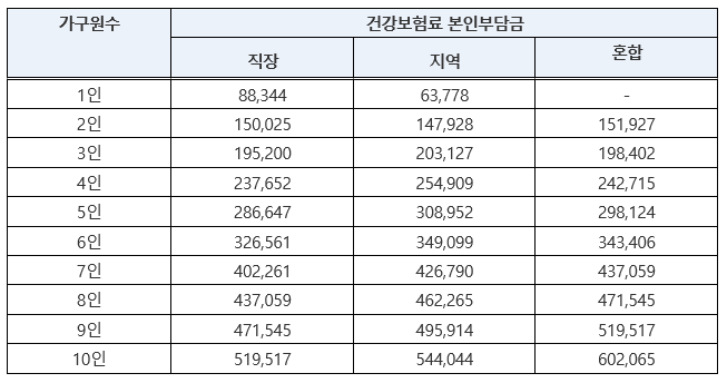 3인 가구 소득하위 70% 기준 건강보험료 본인부담금 : (직장) 195,200원