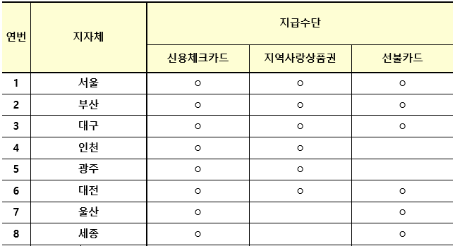 ○ 행안부는 국민 선택의 폭을 넓히고자 지자체에 가급적 지역사랑상품권과 선불카드 등 모든 지급수단을 준비하여 줄 것을 요청했으며, 지자체별 실정에 맞춰 일부 지급수단만 제공되는 경우도 있다.