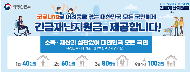 본 저작물은 ‘행정안전부’에서 ‘20년’ 작성하여 공공누리 제1유형으로 개방한 ‘「긴급재난지원금」지급 개시(작성자:재정정책과)’을 이용하였으며, 해당 저작물은 ‘행정안전부 홈페이지’에서 무료로 다운받으실 수 있습니다.