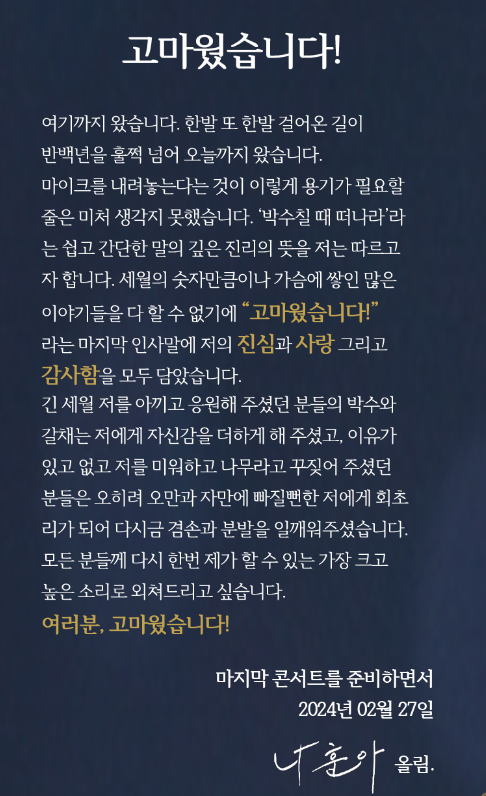 나훈아는 자신의 소속사를 통해 공개한 편지 '고마웠습니다!'에서 "마이크를 내려놓는다는 것이 이렇게 용기가 필요할 줄은 몰랐다"고 털어놓으며, 은퇴를 공식적으로 선언했습니다. 그의 말은 많은 이들의 마음을 울렸습니다. "박수칠 때 떠나라"는 말의 무게를 진심으로 받아들이며, 그는 자신의 마지막 무대를 준비했습니다.